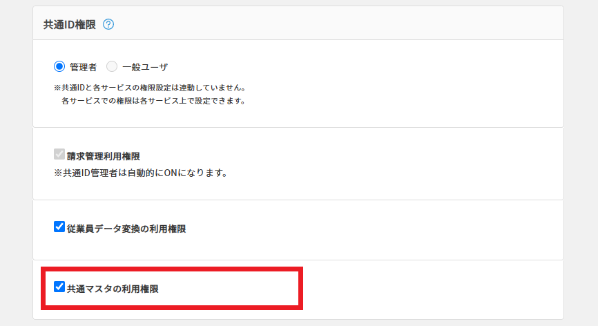機能を利用させたいユーザのユーザ詳細を開き、共通ID権限欄の「共通マスタの利用権限」に