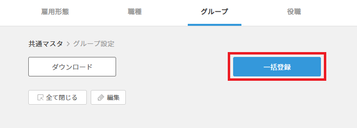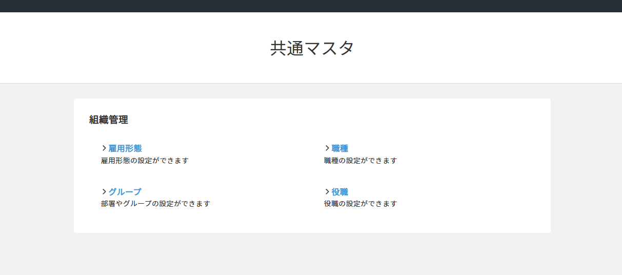 共通マスタでは、ジョブカン労務HR・給与計算で共通する設定(雇用形態・職種・グループ・役職)を