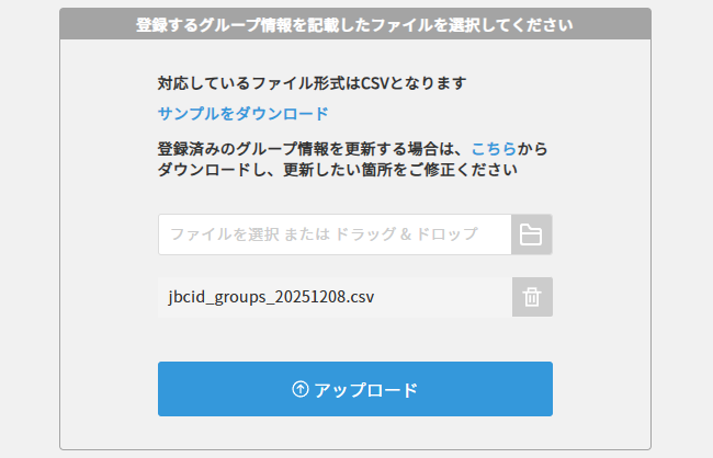 グループは個別に登録するほかに、CSVファイルを利用して一括登録が可能です。