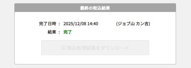 登録処理が完了すると取込結果(完了日時・実行者・結果)が表示されます。