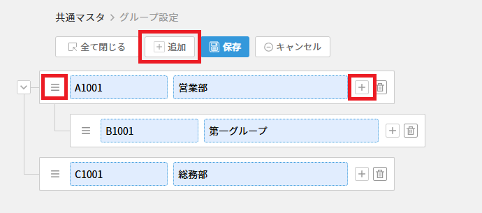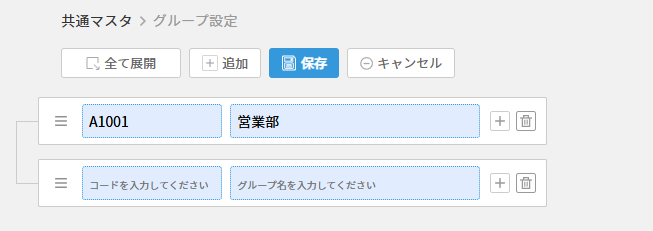 | 階層 | グループの階層を入力します(1~5)。 最も上位の階層が【1】です。 階層が2~5の場合は、親グループコードが必須となります。 |