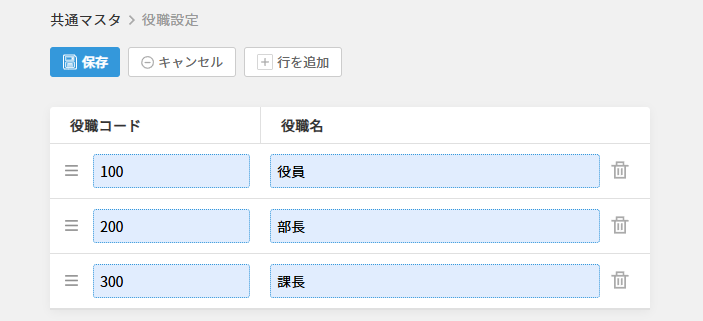 ゴミ箱アイコンをクリックすると役職を削除します。 確認画面は表示されません。 削除は「保存」をクリックすることで確定します。 間違って削除した場合は保存せず、「キャンセル」をクリックして編集前の画面に戻ってください。 |