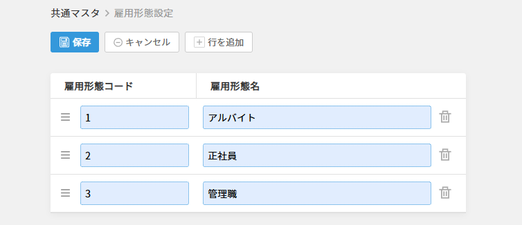 ゴミ箱アイコンをクリックすると雇用形態を削除します。 確認画面は表示されません。 削除は「保存」をクリックすることで確定します。 間違って削除した場合は保存せず、「キャンセル」をクリックして編集前の画面に戻ってください。 |