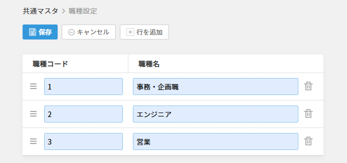 ゴミ箱アイコンをクリックすると職種を削除します。 確認画面は表示されません。 削除は「保存」をクリックすることで確定します。 間違って削除した場合は保存せず、「キャンセル」をクリックして編集前の画面に戻ってください。 |