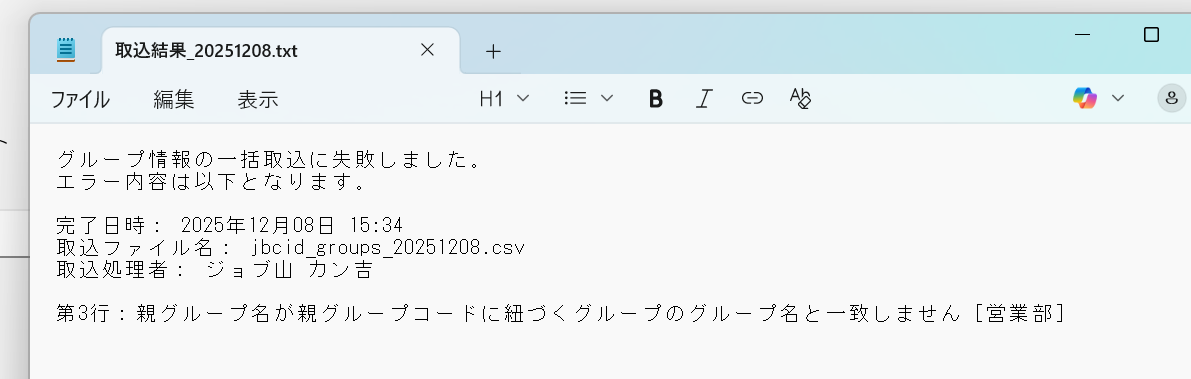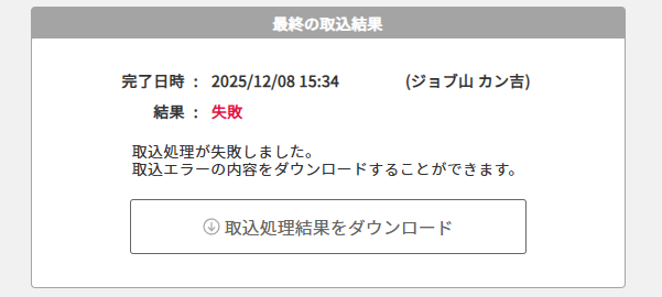 取込みに失敗した場合のみ、取込処理結果をダウンロードできます。