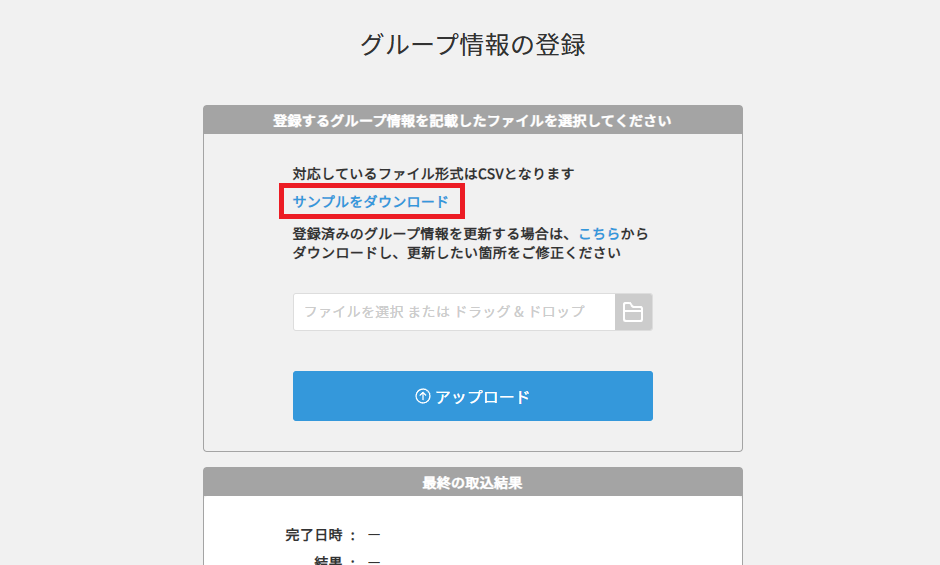 一括登録でグループを登録する場合、まずはサンプルデータをダウンロードし、それを編集して